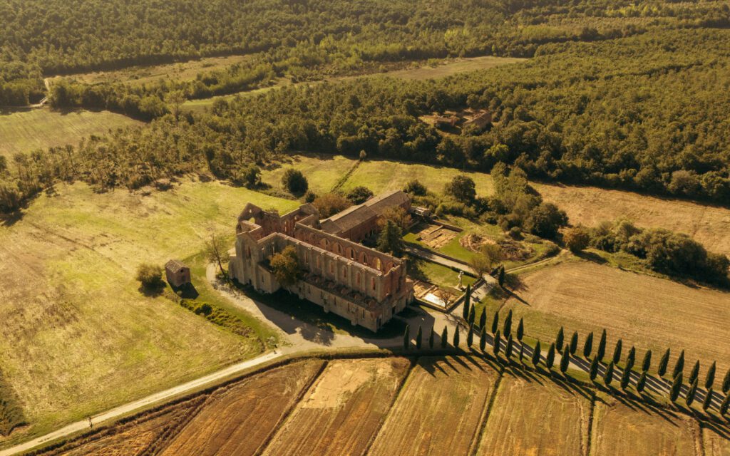 Nel cuore della campagna toscana, tra le colline morbide di Chiusdino, sorge imponente l’Abbazia di San Galgano, e lì, dove un tempo c’era il tetto, restano solo le nuvole lente e il passaggio di qualche rondine in volo, si, perché ciò che rende unica e inconfondibile l‘Abbazia di San Galgano è che il tetto non c’è più, un crollo risalente al Settecento l’ha trasformata in una cattedrale a cielo aperto, dove di giorno il sole e la notte le stelle, fanno da faro a questa bellezza spoglia e senza tempo.